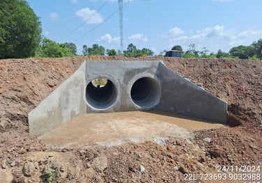 Executamos valas, canaletas, bueiros e dispositivos de drenagem, dimensionados conforme as condições do terreno, regime de chuvas e cargas operacionais, assegurando o correto escoamento das águas e a proteção de taludes, estradas de acesso e fundações. As soluções são integradas ao planejamento ambiental, reduzindo impactos e garantindo conformidade com os requisitos técnicos e legais.